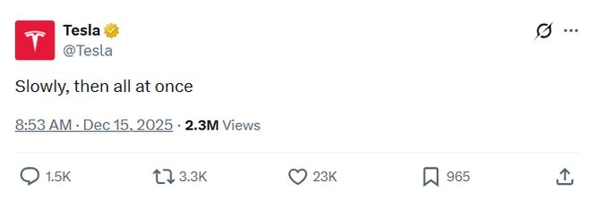 一边是万亿市值的诱惑,另一边是Waymo等巨头的铜墙铁壁,脚下则是容不得半点差错的安全红线。X上的那句“Slowly, then all at once”,既可以是成功的预言,也可以是危机的隐喻。