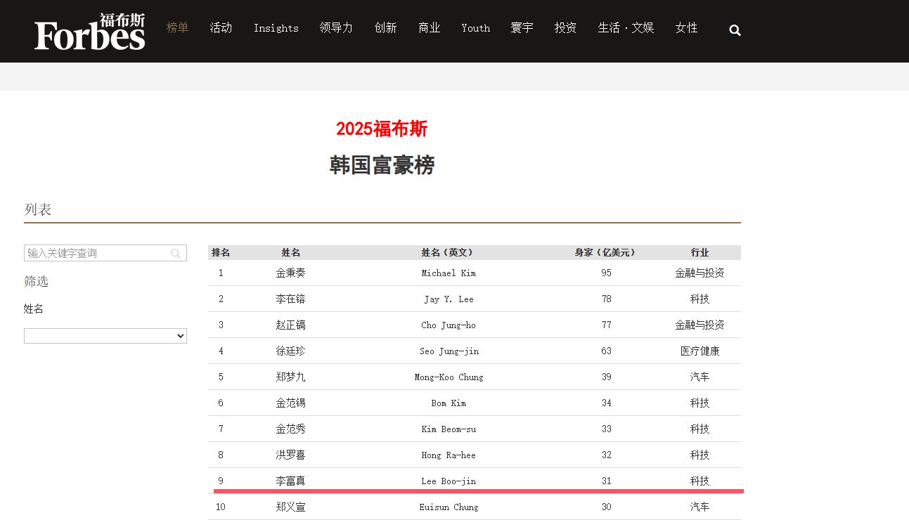 2025年,她以31亿美元身家位列《福布斯》韩国富豪榜第9名。