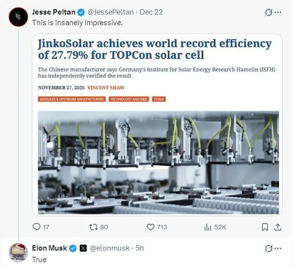 12月25日,晶科能源近日宣布,其基于TOPCon技术平台的高效电池最高光电转换效率达27.79%,经德国哈梅林太阳能研究所(ISFH)权威认证,刷新世界纪录。社交平台X上的一位用户分享了有关晶科能源这项新纪录的报道,并评论称:“这真是令人疯狂地印象深刻。”马斯克评论称:“确实如此。”