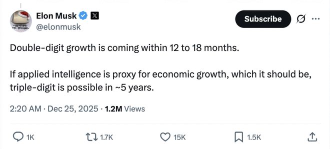 “两位数增长即将到来。” 马斯克在X上斩钉截铁地表示,随着AI技术从实验室走向全产业应用,未来12到18个月,美国经济将实现爆发式增长。他甚至给出了一个更令人瞠目结舌的推断:“如果将应用智能视为经济增长的指标,五年内实现三位数(100%以上)的增长也是可能的。”