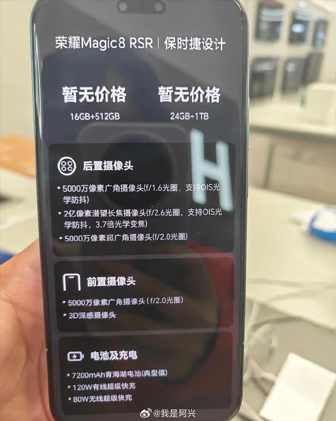 1月12日,博主“我是阿兴”分享了荣耀Magic8 RSR保时捷设计真机图片,并透露部分配置信息。该博主还透露,该机后置三摄系统包括一颗5000万像素广角主摄、一颗2亿像素潜望式长焦摄像头以及一颗5000万像素超广角镜头,前置则为5000万像素超广角与3D深感摄像头的组合。机身内置7200mAh青海湖电池,支持120W有线与80W无线超级快充。此外,手机提供16GB+512GB与24GB+1TB两种存储规格。