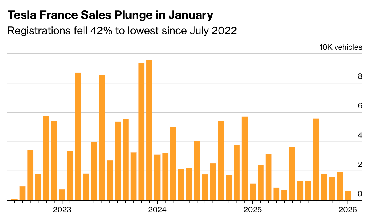 据彭博社报道,特斯拉在欧洲市场的销量下滑态势延续至新的一年,其注册量在两大主要电动汽车市场出现大跌。法国汽车协会(PFA)的数据显示,今年1月,特斯拉在法国的销量下降了42%,仅为661辆,创下三年多以来的最低水平。挪威曾是特斯拉去年在欧洲表现不错的唯一市场,但是该公司1月份的新车注册量暴跌88%。