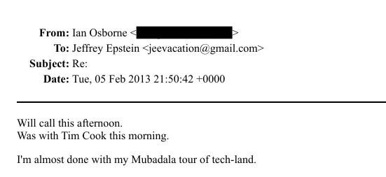 在这段往来邮件之间,档案中还出现了一位名为伊恩·奥斯本(Ian Osborne)的关键人物。 2013 年 2 月,他在发给爱泼斯坦的邮件中写道,自己“今天早上刚和Tim Cook在一起”,并表示稍后会与爱泼斯坦通话,同时自称几乎结束了自己在“Mubadala 的科技版图之旅”。 邮件地址虽然被涂黑,但从身份背景与公开报道看,外界普遍认为此人即是英国投资人伊恩·奥斯本——在 2017 年与查马斯·帕里哈皮蒂亚(Chamath Palihapitiya)共同发起 SPAC“Social Capital Hedosophia”前,他曾被媒体形容为“亿万富翁掮客”,专门为超级富豪提供撮合与公关服务。