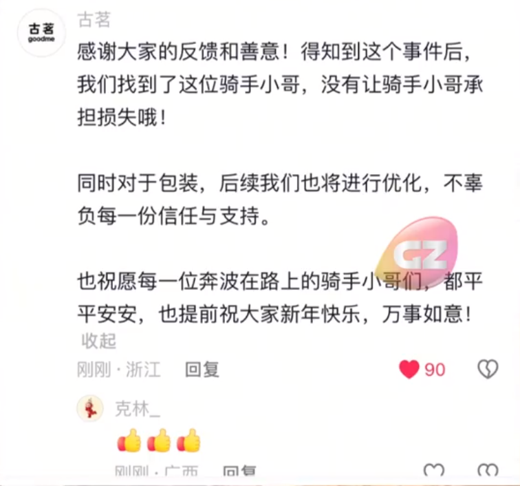 古茗官方也通过社交账号回应称,得知这起事件后,已找到了这位骑手小哥,没有让骑手小哥承担损失。同时对于包装,后续也将进行优化。