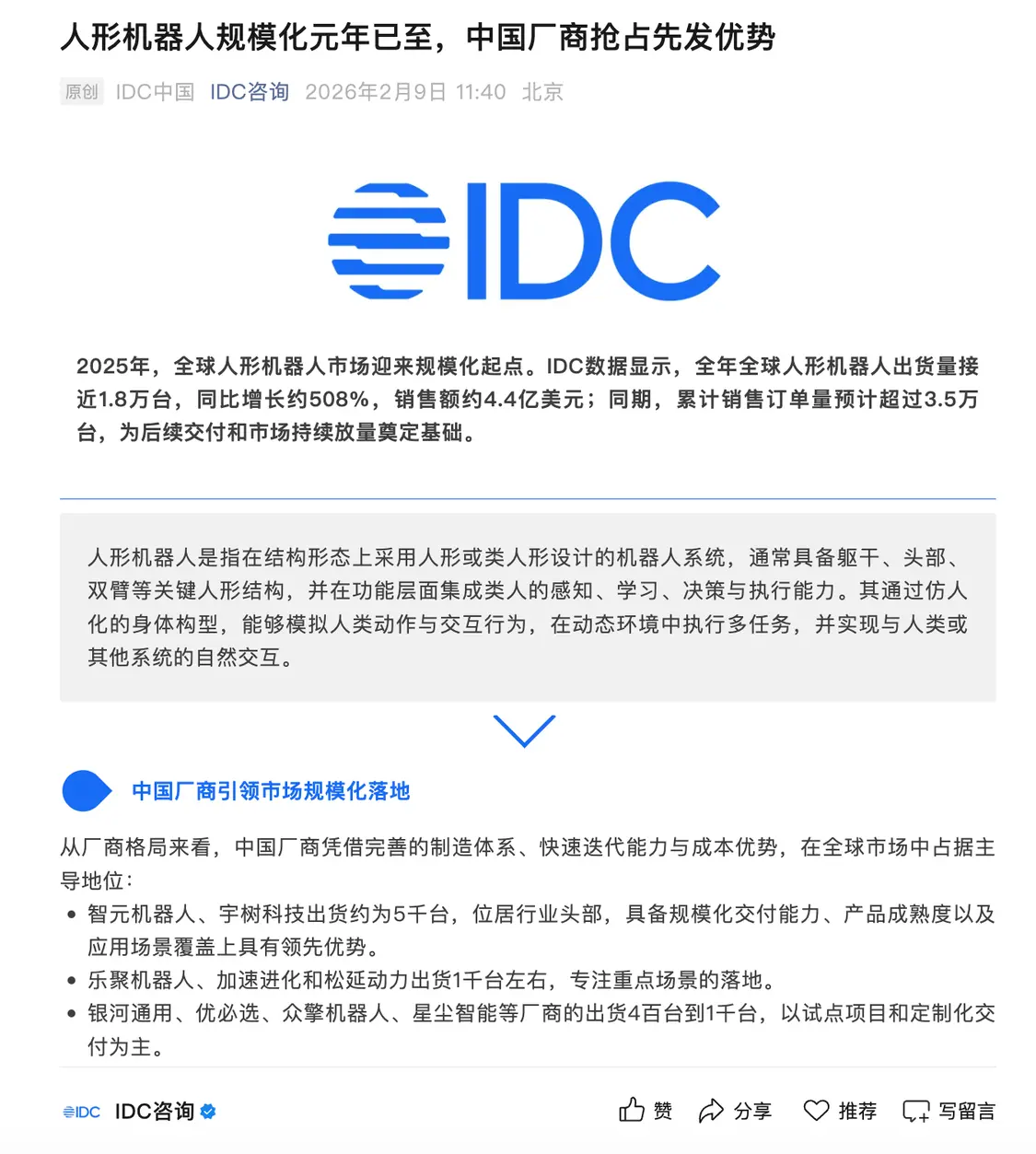 IDC分析指出,中国厂商凭借完善的产业链、快速迭代能力与成本优势,在当前阶段的人形机器人规模化落地中占据先发优势。未来行业竞争将从硬件销售向技术服务、生态建设等维度深化。