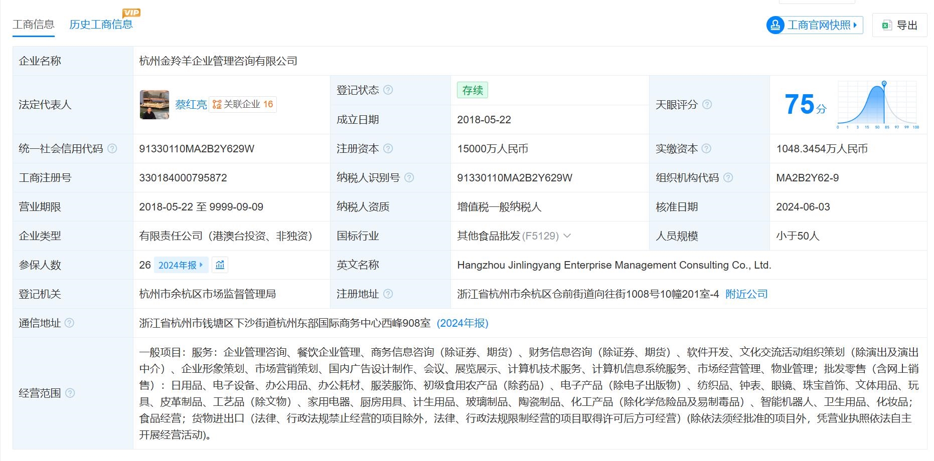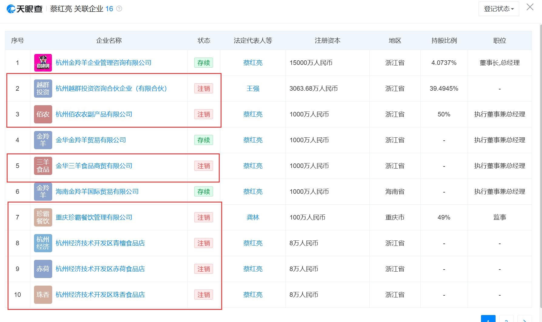 截至目前,蔡红亮共关联企业16家,其中杭州越群投资咨询合伙企业(有限合伙)、杭州佰农农副产品有限公司、金华三羊食品商贸有限公司、重庆珍霸餐饮管理有限公司、杭州经济技术开发区青檀食品店、杭州经济技术开发区赤荷食品店、杭州经济技术开发区珠香食品店等企业已经注销,仅有3家处于存续状态。