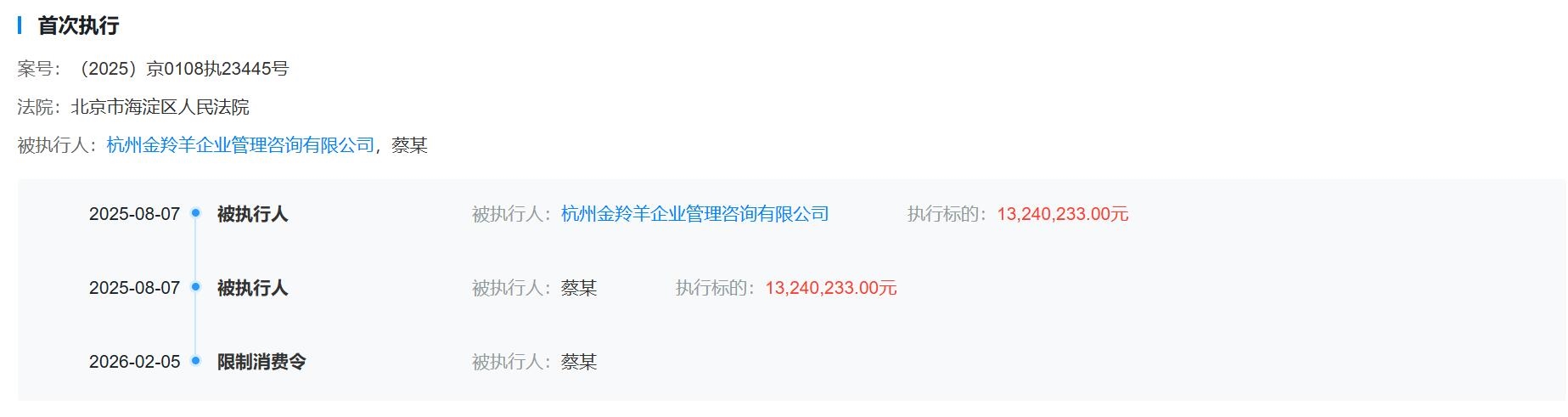 值得一提的是,蔡红亮及其公司杭州金羚羊企业管理咨询有限公司在去年8月成为被执行人,蔡红亮还被限制高消费。