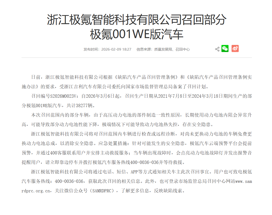 国家市场监督管理总局官网显示,极氪汽车受浙江吉利汽车有限公司委托向国家市场监督管理总局备案了召回计划。召回编号S2026M0023V:自2026年3月6日起,召回生产日期从2021年7月8日至2024年3月18日期间生产的部分极氪001WE版汽车,共计38277辆。