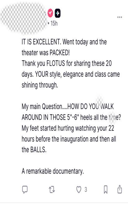 但支持者不少在平台上贴出票根以及赞扬影片拍出了第一夫人“优雅和智慧”。这一情况在保守右翼平台聚集的Truth social平台上更为普遍。