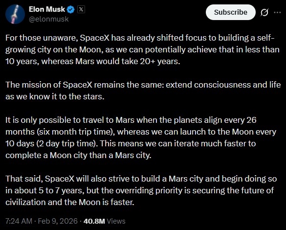 马斯克于当地时间周日晚间在社交媒体上发表长文,表示SpaceX的发展方向由火星殖民转向月面永久基地:“SpaceX已改变工作重心,目标是在月球建立一座有自持力的城市,实现该目标也许用不了十年,而火星基地要花不止二十年。”