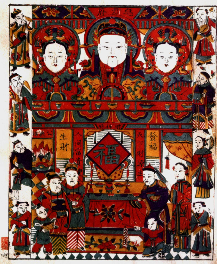 清代山东潍县的灶君图。画面中间的是灶神和他的一对妻妾,两边是“八仙”,下边是物主一家迎接怀抱元宝的财神。图片来自《中国民间美术全集·绘画卷》,吉林美术出版社2002,第113页。