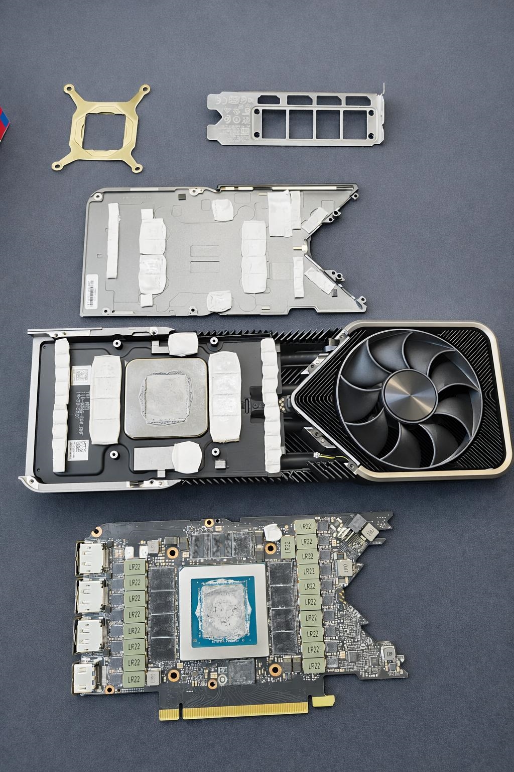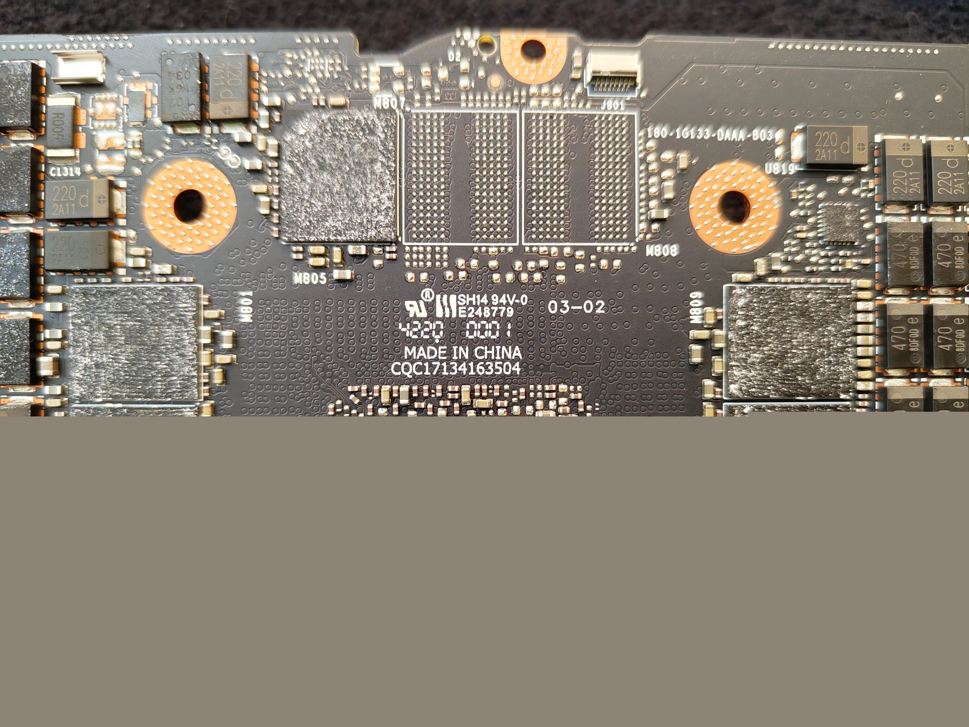 显存位多达20个,正反各一半,每颗1GB组成总计20GB。注意还有四个空焊位。