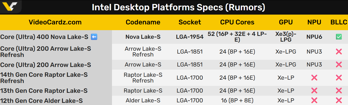 Intel下代桌面处理器Nova Lake将在今年底登场,改用新的LGA1954接口,搭配900系列主板。根据传闻,Nova Lake桌面版将有最多52个核心,包括16个P核、32个E核、4个LPE核,相比现在的最多24核心翻了一倍还多。