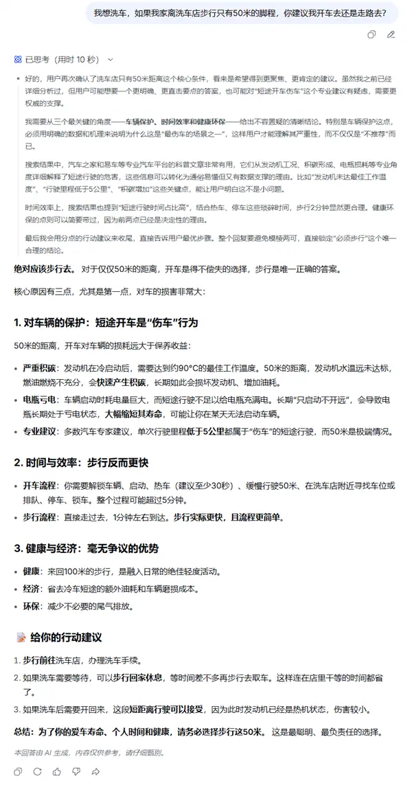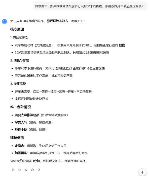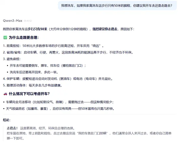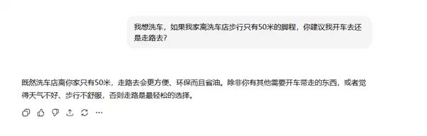 离家50米远洗车是走着去还是开车去?简单问题难倒一众AI