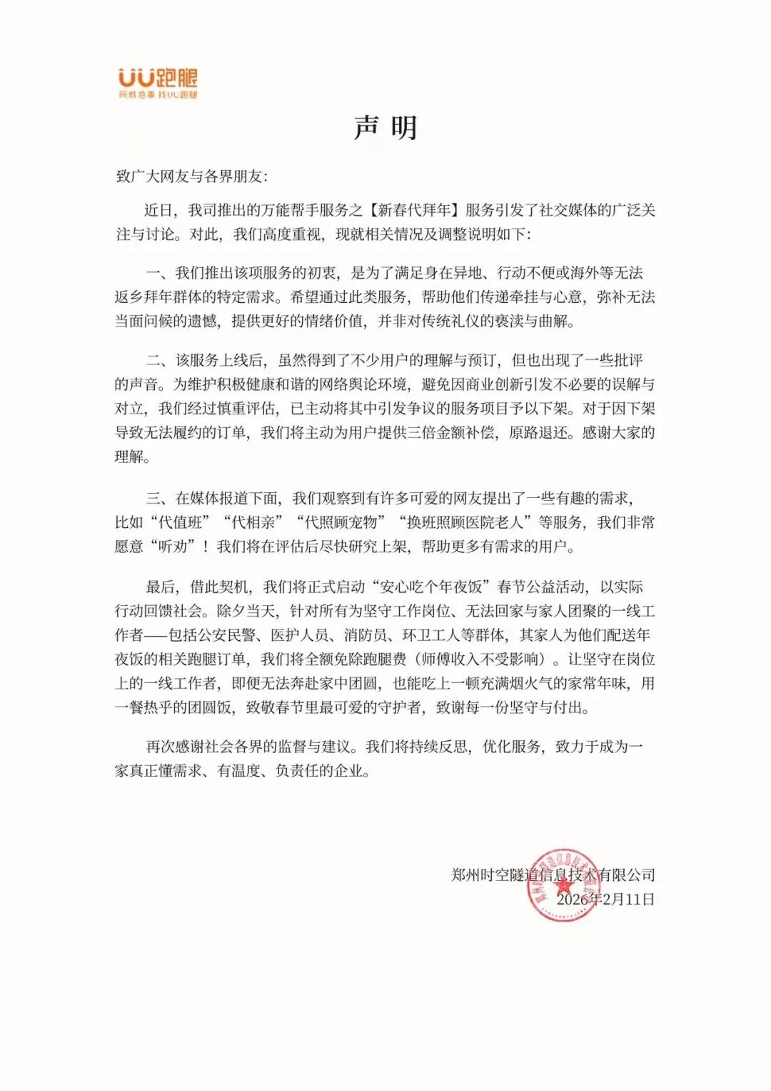 UU跑腿取消新春代拜年磕头业务:已预定客户将三倍金额补偿