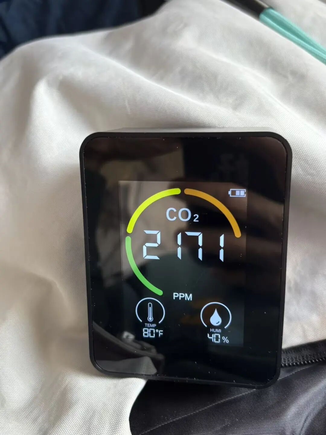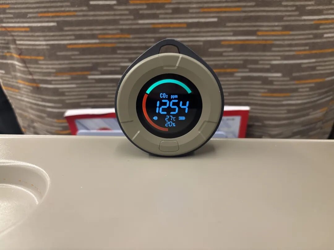 因为飞机的舱体相较高铁更拥挤、逼仄,咱们一上飞机二氧化碳浓度就遥遥领先来到了1200ppm。
