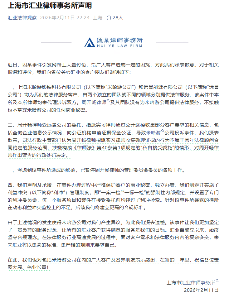 米哈游宣布终止合作后 汇业律师事务所公开致歉