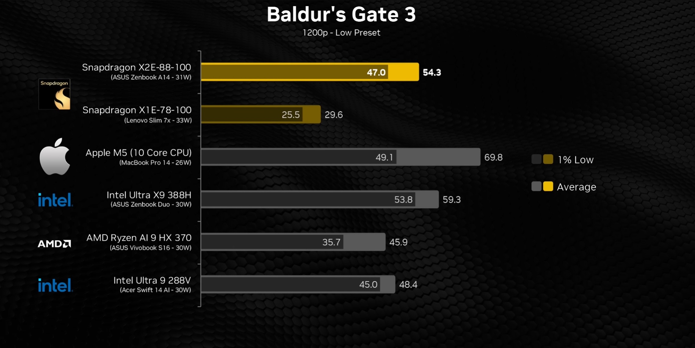 在放出高通骁龙X2 Elite的跑分数据之后,Hardware Canucks又发布了该处理器的初步游戏性能测试。数据显示,骁龙X2 Elite游戏性能较上代X Elite实现了巨大飞跃,测试的三款游戏中帧率最高提升近84%,但在与苹果M5的正面交锋中仍处于下风。