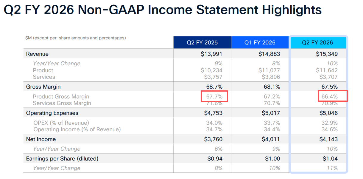 公司第二财季的产品毛利率为66.4%,同比下降130个基点。Patterson表示,这主要受产品结构变化和内存成本上升所致。