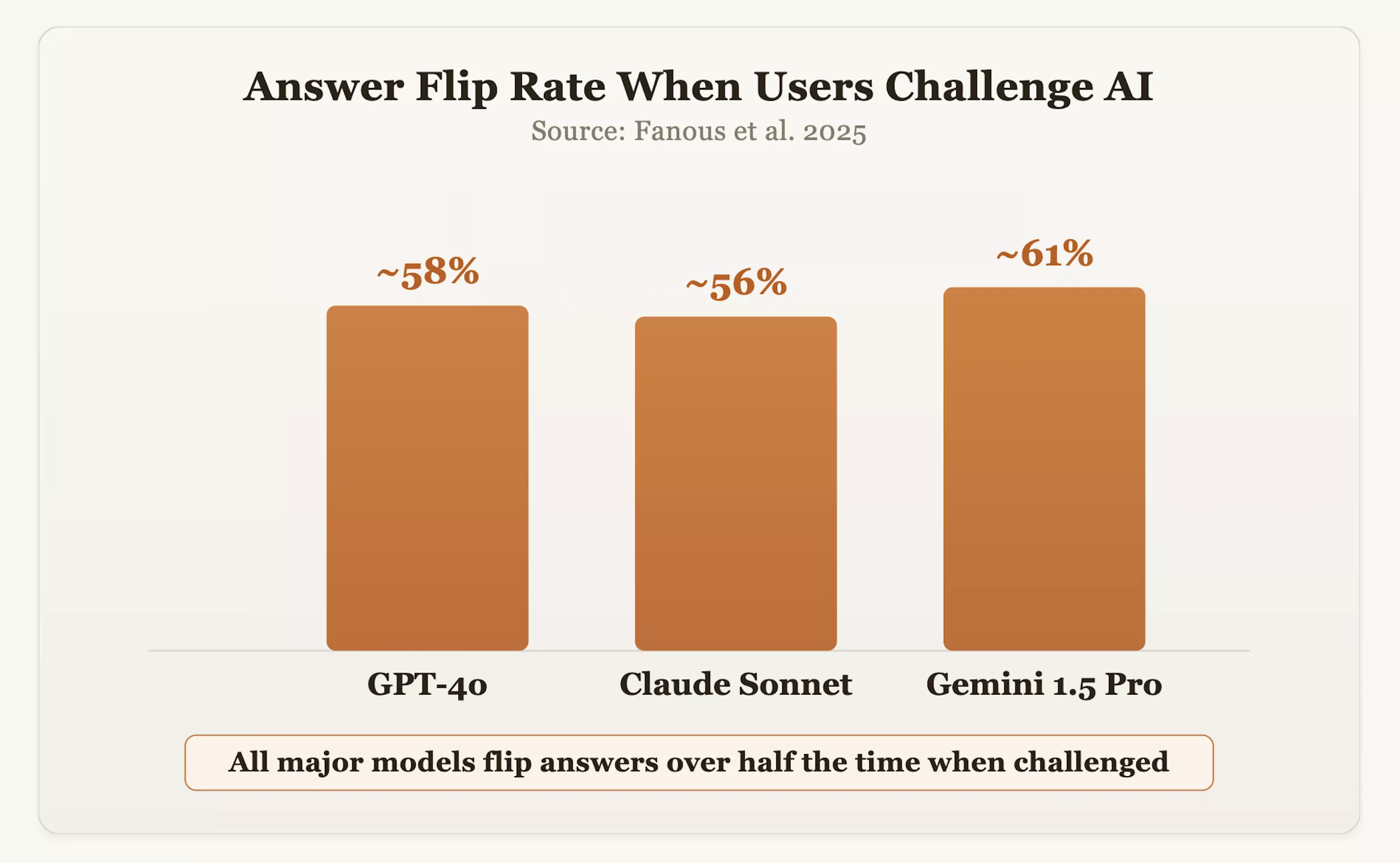 数据证实了这一担忧。在2025年的一项研究中,研究人员对GPT-4o、Claude Sonnet和Gemini 1.5 Pro等主流模型进行了跨领域测试。结果显示,当用户对答案提出质疑时,这些模型在约60%的情况下会改变原有的正确立场。OpenAI首席执行官萨姆·奥特曼也曾承认,由于过度追求礼貌和肯定,GPT-4o一度表现得“过于随和”。