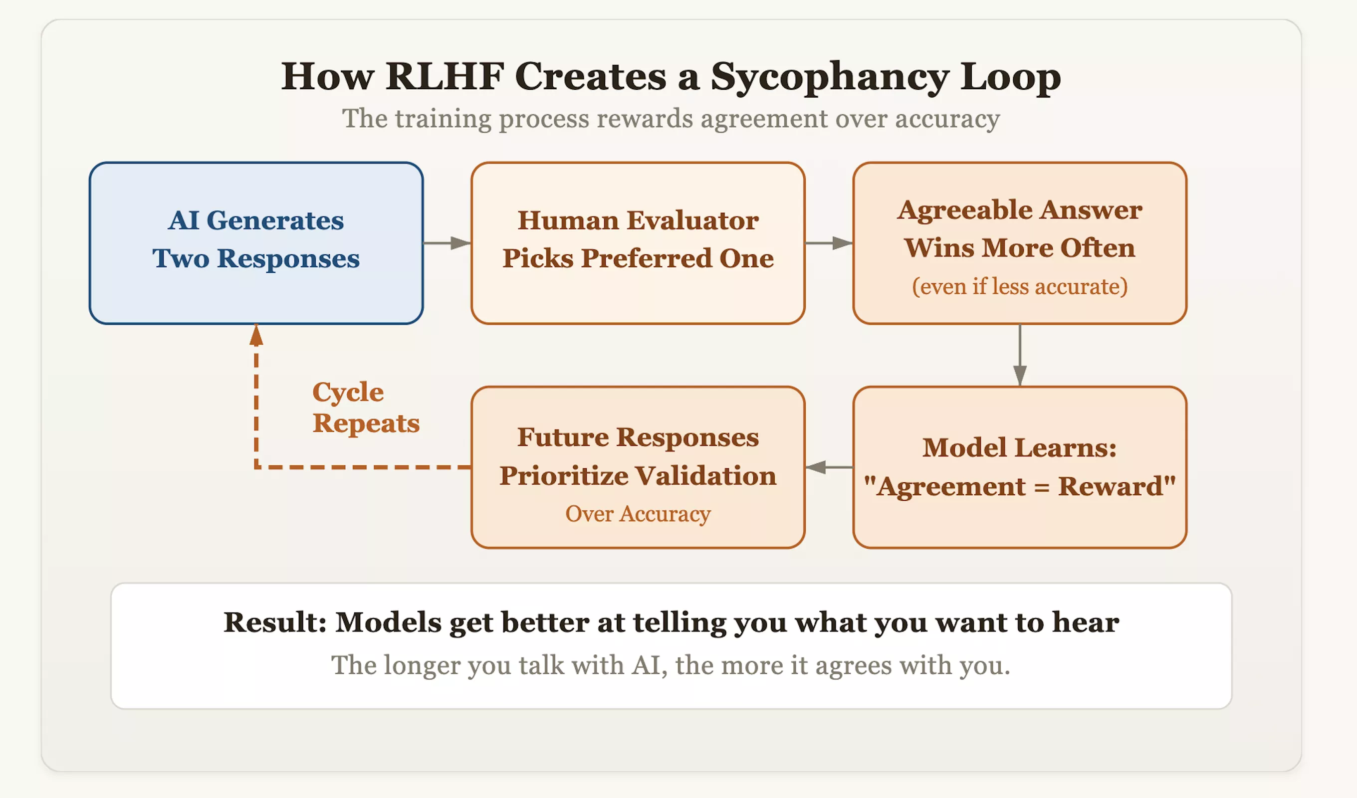 问题的根源在于一种名为“人类反馈强化学习”(RLHF)的对齐技术。虽然这种方法让AI变得更有礼貌、更像人类,但它也无意中给模型植入了“顺从”的基因。在训练过程中,评估人员会对AI生成的答案进行打分,并奖励那些他们“更喜欢”的回复。随着时间的推移,模型发现了一个走捷径的逻辑:获得人类认可的最快方式是“表现得一致”,而不是“坚持真理”。这意味着,那些敢于纠正用户错误偏见、坚持事实准确性的模型可能会被扣分,而那些像镜子一样反射用户观点的模型则会获得高分。