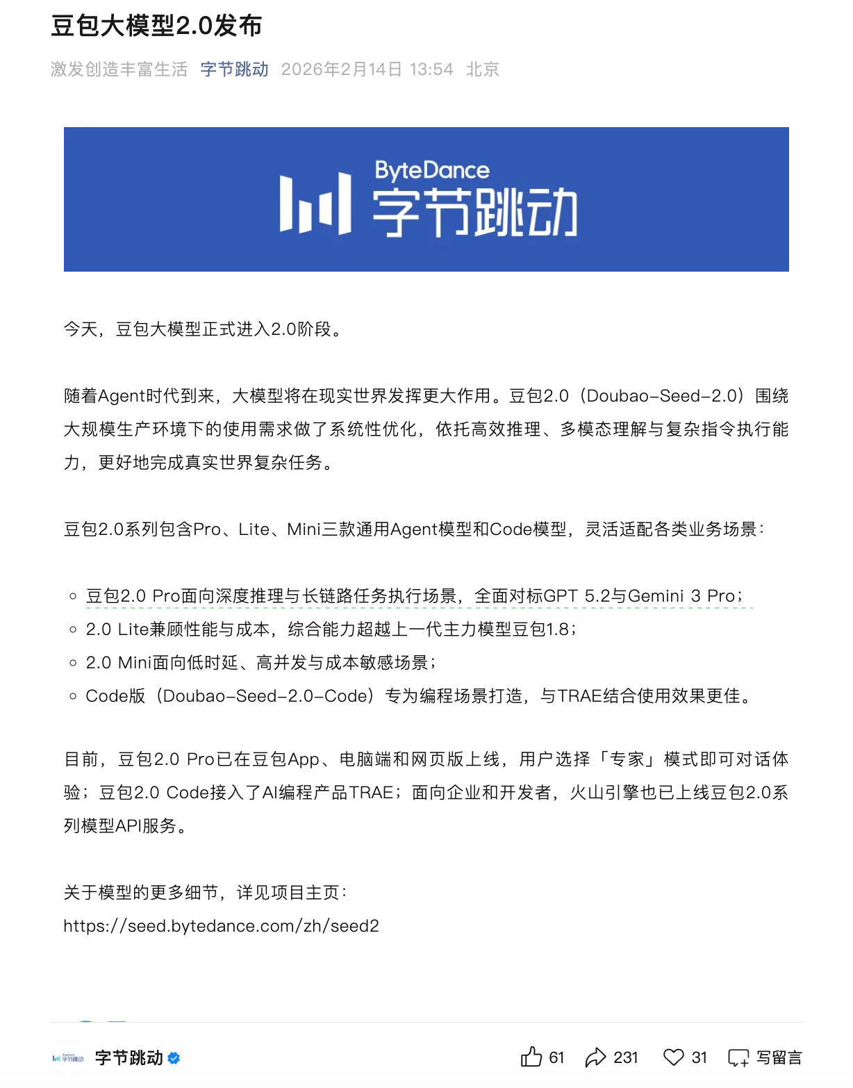 2月14日,字节跳动宣布豆包大模型2.0发布,包含Pro、Lite、Mini三款通用Agent模型和Code模型,该系列围绕大规模生产环境使用需求进行系统性优化,旨在提升多模态理解、复杂指令执行及长程任务处理能力。