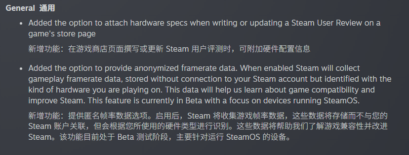 除了评论显示硬件规格外,本次更新还加入匿名化帧率信息选项,启用后Steam会在游戏过程收集帧率数据,但不会与个人Steam帐号绑定,而是与使用中的硬件类型关联。