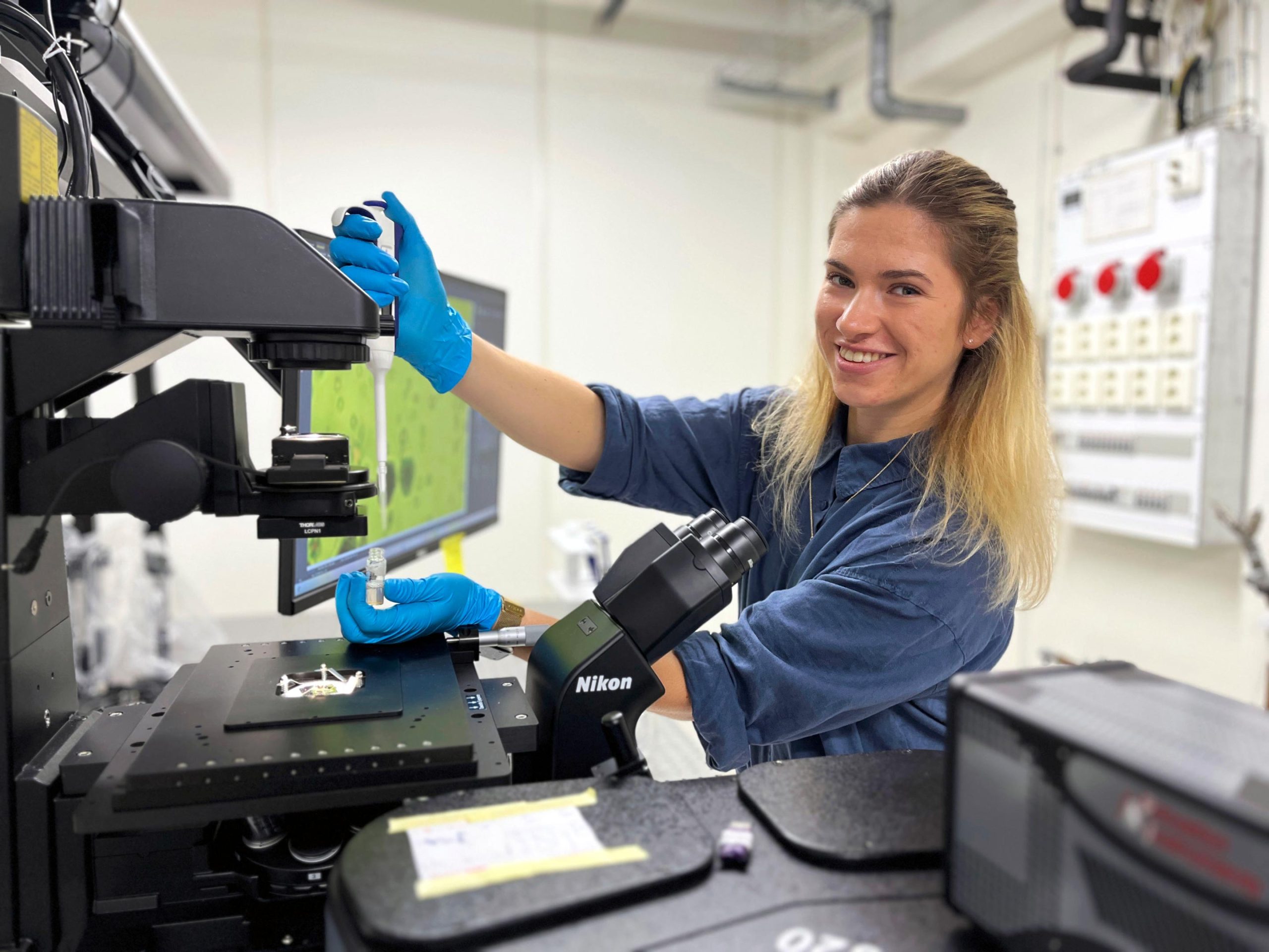 这些纳米级的间隙就像微型的“光室”或谐振器。当卤素灯的光线照射到这些充满液体的空腔时,光波在其中来回反射并发生干涉,从而产生特定的颜色。通过光学显微镜和光谱仪的观察,研究人员可以在显示器上清晰地看到金箔碎片在金黄色的背景中闪烁着红色或绿色的光芒。这些颜色的变化直接对应着金箔与基底之间距离的改变,从而实时揭示了微观力场的动态平衡。