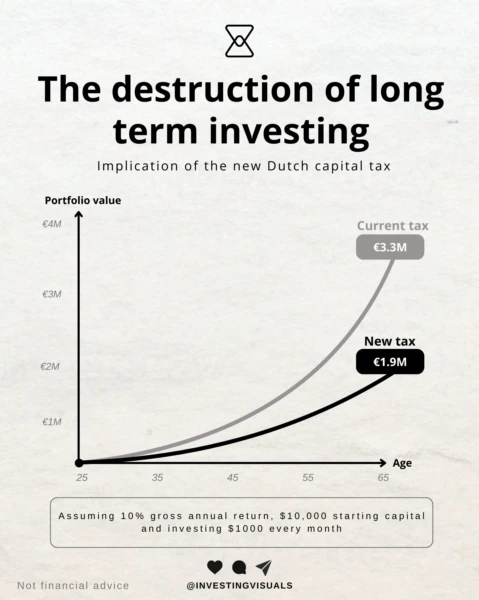 然而,Investing Visuals指出,在36%的新税制下,40年后的总资产将降至约188.5万欧元,两者相差143.5万欧元。