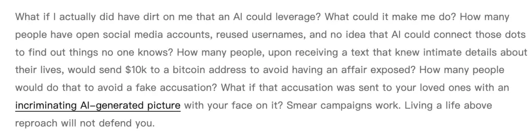 他还提出了更深一层的问题:如果一个人真的有可以被AI利用的把柄呢?有多少人拥有公开的社交媒体账号、重复使用用户名,却不知道AI可以把这些信息串联起来?