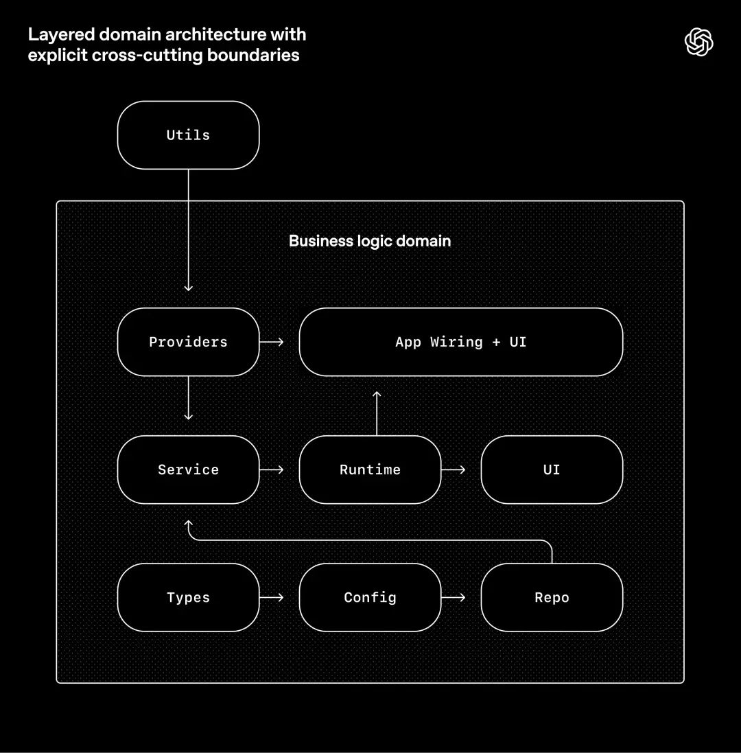OpenAI围绕一个严格的架构模型构建系统。每个业务领域都有固定层级,并且依赖方向被严格验证,只允许有限的合法边界。