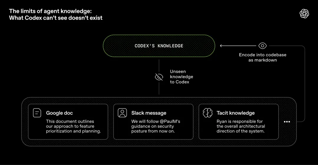 既然仓库完全由智能体生成,OpenAI研究人员的一个目标,就是让智能体只靠仓库本身,就能理解完整业务领域。