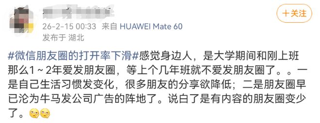 有网友观察到,“感觉身边人,是大学期间和刚上班那么1~2年爱发朋友圈,等上个几年班就不爱发朋友圈了。一是自己生活习惯发变化,很多朋友的分享欲降低;二是朋友圈早已沦为牛马发公司广告的阵地了。说白了是有内容的朋友圈变少了。”