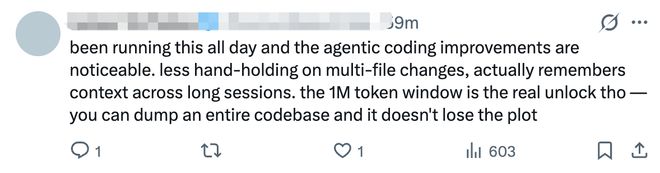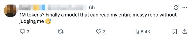 100万token上下文窗口被多位开发者提及为最大亮点。“100万个token?终于找到一个能读取我整个混乱代码库而不评判我的模型了。”一位网友称。另一位网友也将模型运行了一整天,提到智能编码方面的改进明显:“多文件修改时不再需要过多干预,而且能够记住长时间会话中的上下文。不过,100万个token窗口才是真正的亮点,你可以导出整个代码库,它也不会丢失任何信息。