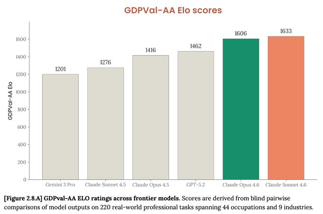 GDPval-AA是一个独立的评估框架,用于测试模型在具有经济价值的真实世界专业任务上的表现,Claude Sonnet 4.6在Claude Opus 4.6、GPT-5.2等所有比较模型中排名第一。