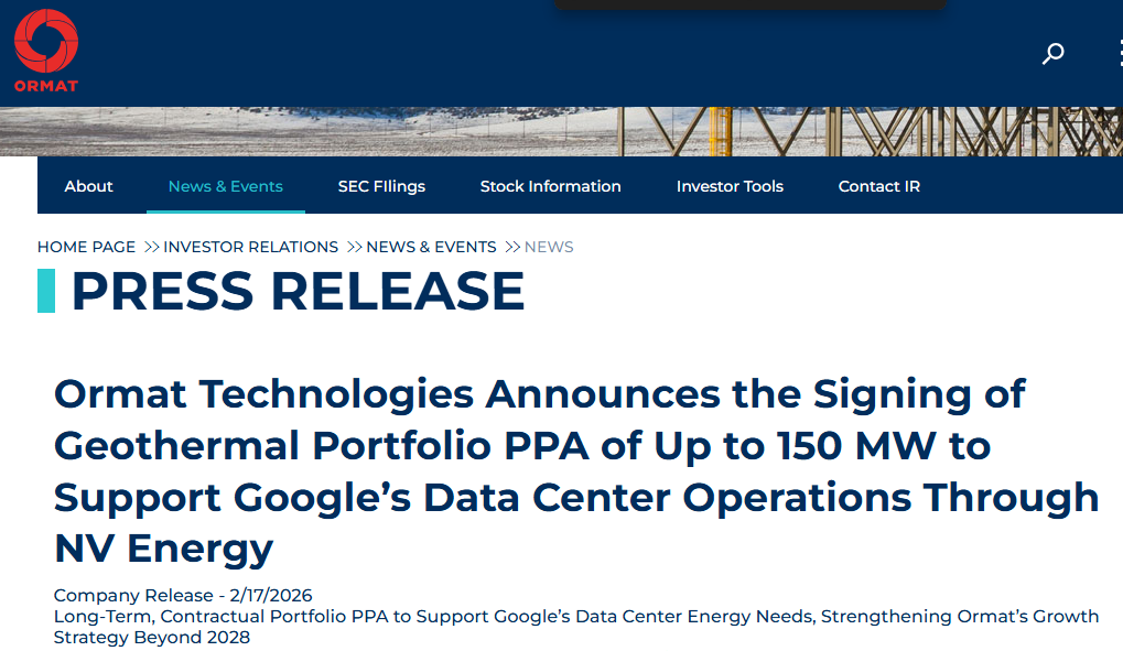 Alphabet旗下Google公司(Google)计划从可再生能源公司奥玛特科技(Ormat Technologies)采购地热能,以助力其位于内华达州的数据中心集群实现供电 。