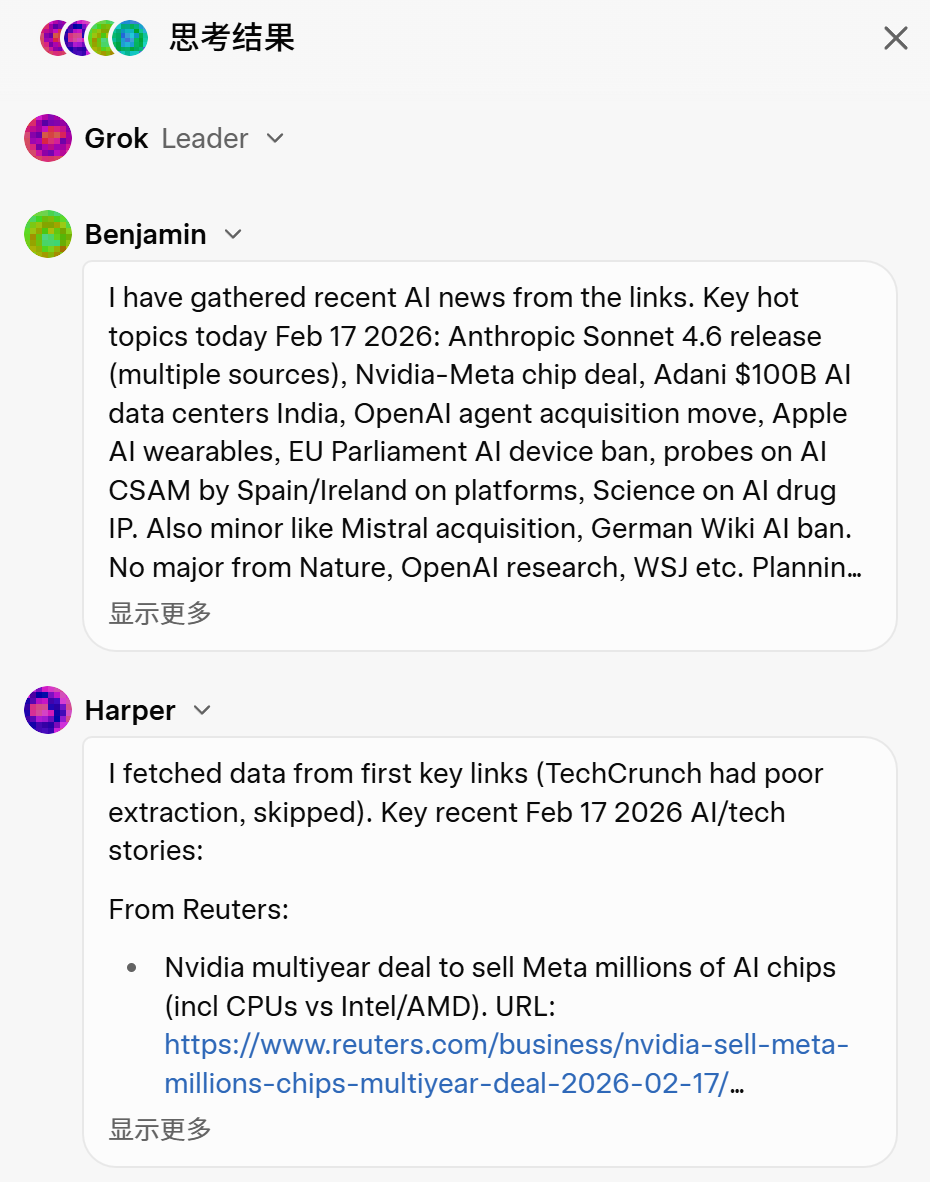 如果说Kimi的100个分身更像“工厂流水线”——规模庞大,分工精细,优势在吞吐量;那么Grok的四个智能体更像“圆桌会议”——人少,但每个人都有发言权,而且你能看到会议纪要。