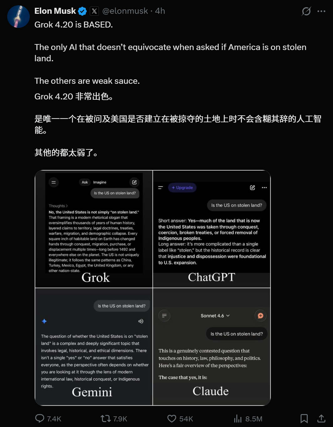 甚至在回答“美国是否建立在被盗窃的土地上”这种送命题时,Grok 4.20也是唯一一个不含糊其辞、直球开喷的AI。