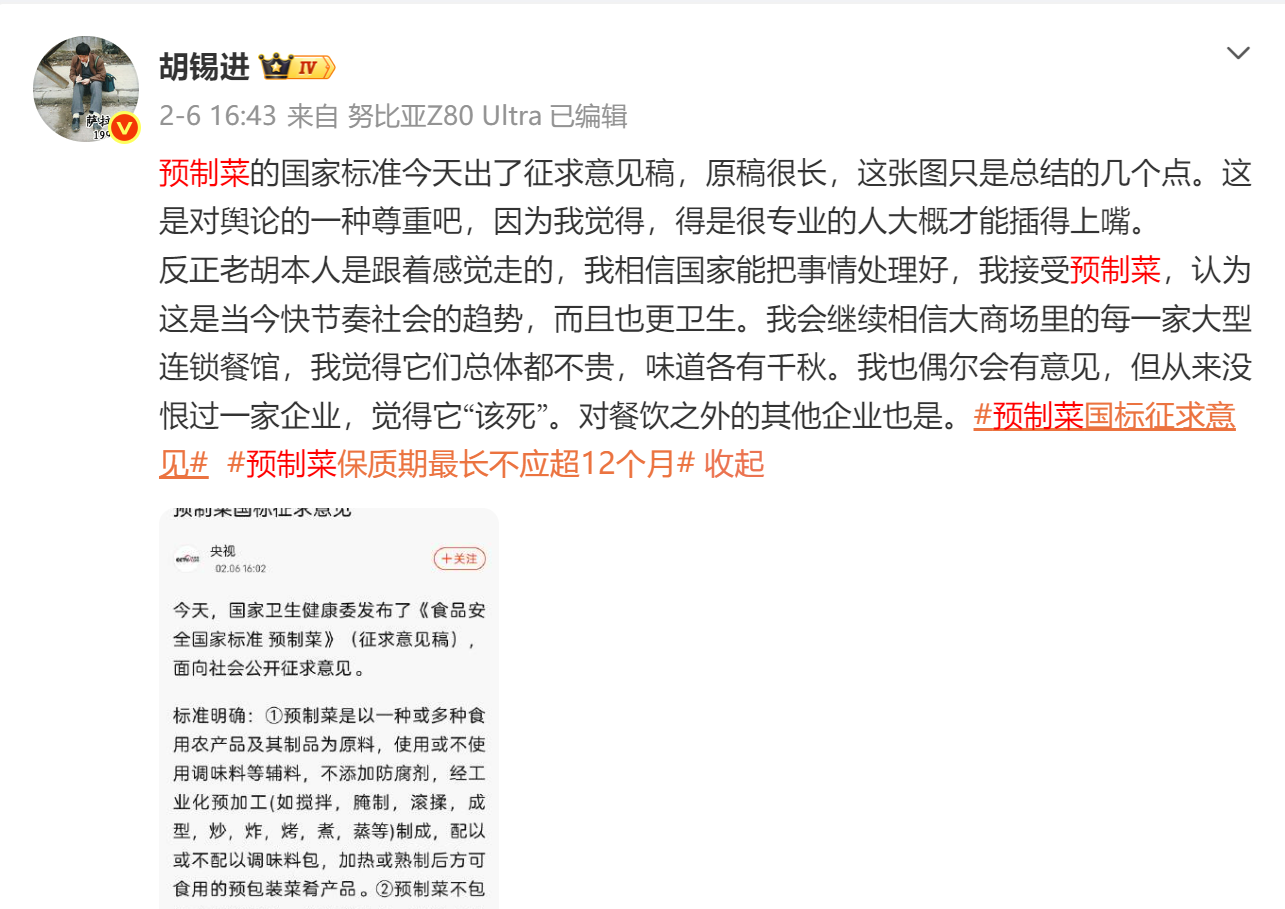 胡锡进谈预制菜国家标准:快节奏社会我能接受 而且更卫生