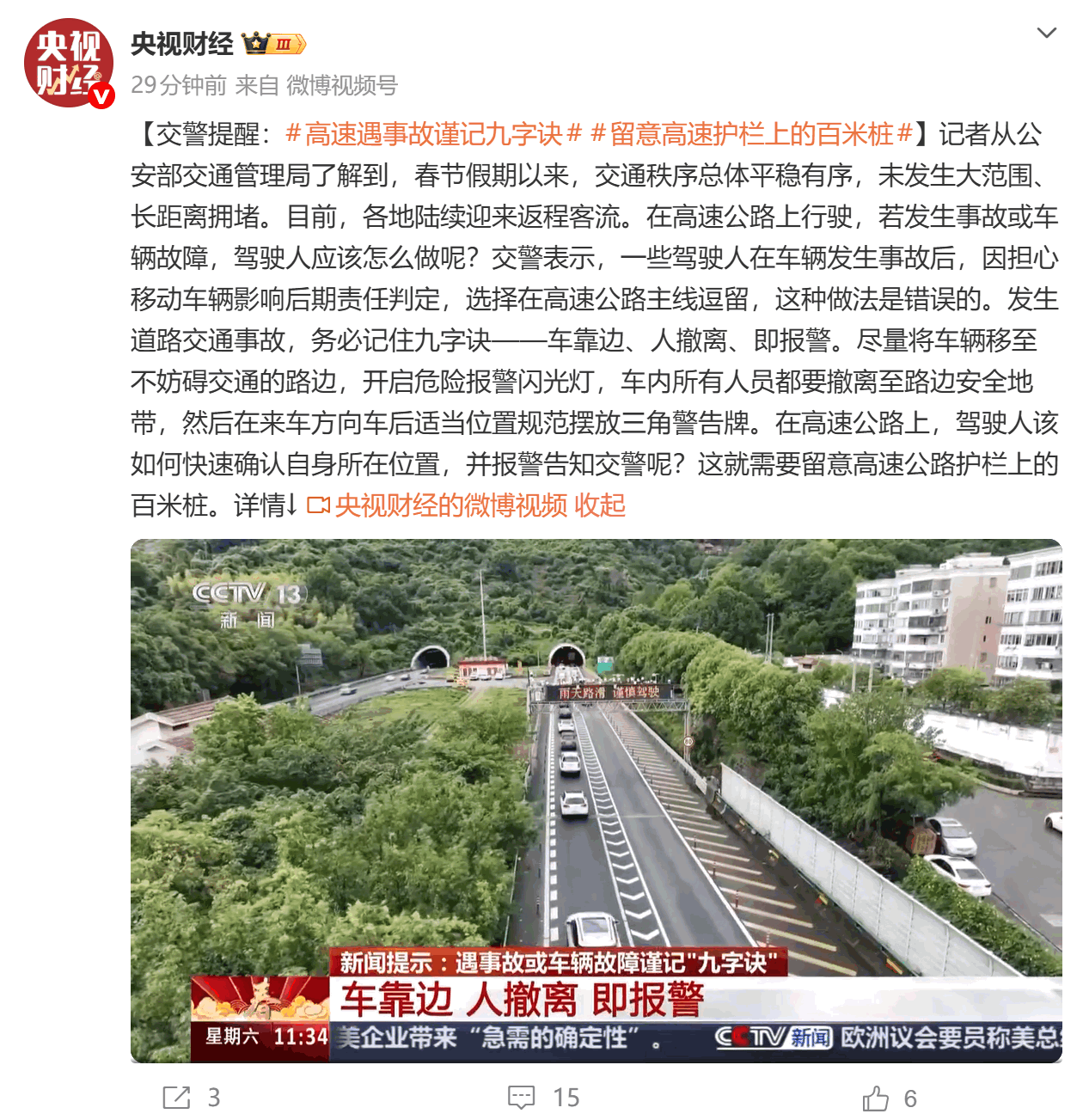 据央视财经报道,目前,各地陆续迎来返程客流。在高速公路上行驶,若发生事故或车辆故障,驾驶人应该怎么做呢?交警表示,一些驾驶人在车辆发生事故后,因担心移动车辆影响后期责任判定,选择在高速公路主线逗留,这种做法是错误的。