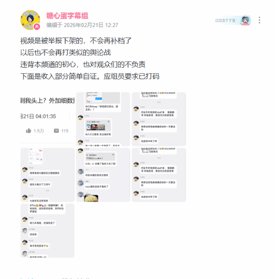 然而,糖心蛋字幕组的视频并非主动下架,而是因被举报而下架。在随后的回应中,糖心蛋并未表达歉意,反而表示:“视频是被举报下架的,不会再补档了。以后也不会再打类似的舆论战,违背本频道的初心,也是对观众的不负责。”