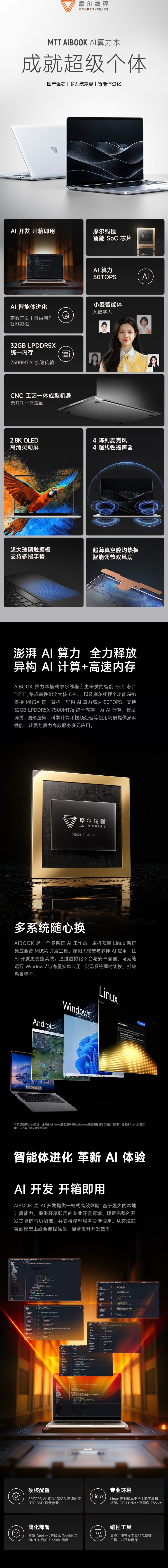 硬件配置上,MTT AI Book内置32GB LPDDR5X-7500内存,板载1TB SSD,可充分满足大容量存储需求,兼顾算力运算与日常使用的硬件要求。