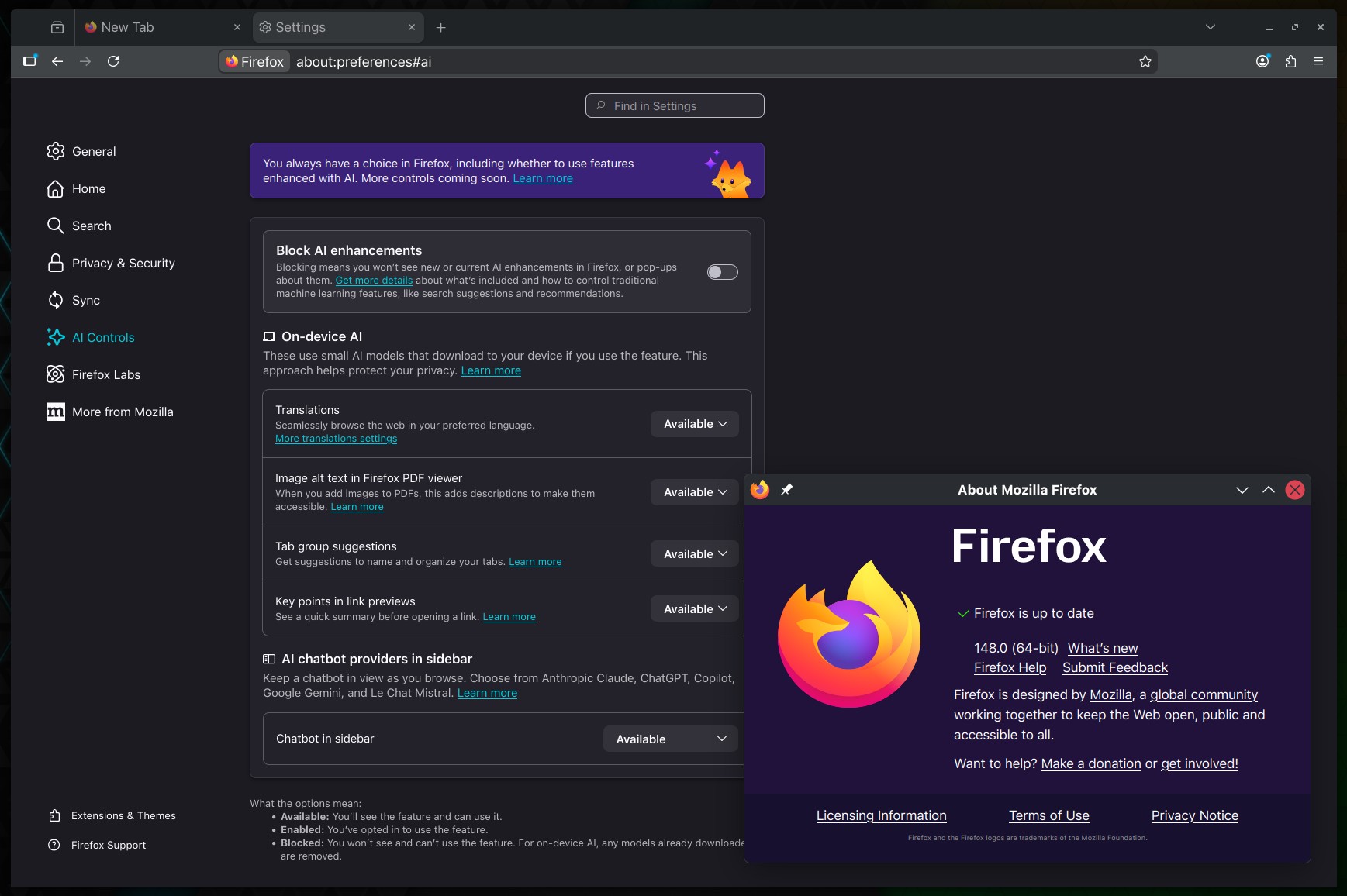 Mozilla 今日面向正式版用户推送了 Firefox 148.0 更新,为浏览器带来了此前承诺的 AI 控制功能,以及一系列备份、无障碍与拖放相关修复。这次更新尤其针对不希望在浏览器中看到任何 AI 相关体验的用户,提供了集中管理与一键关闭的选项。