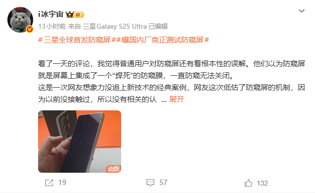据数码博主“i冰宇宙”介绍,三星S26 Ultra采用物理防窥屏设计,在屏幕内部加入可控视角的光学结构,从物理层面收窄侧视可见范围。