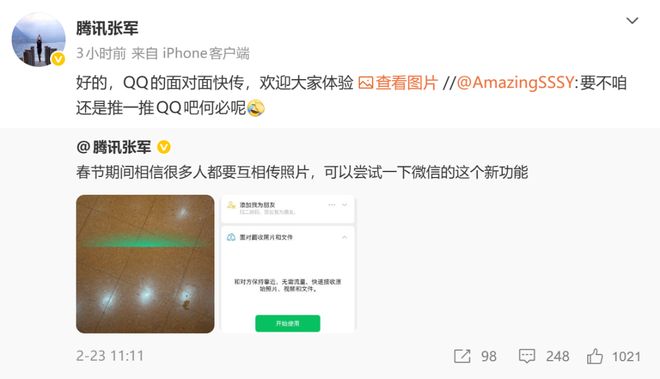 腾讯公司公关总监张军也发布微博宣传微信的“面对面收照片和文件”功能。此外,他提到QQ也有面对面快传功能,欢迎大家体验。