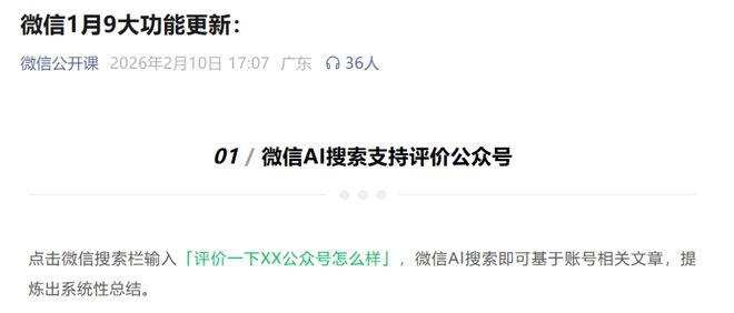 近期,微信新功能密集上线。2月10日,“微信公开课”官微公布了微信1月更新的9大功能,分别为:微信AI搜索支持评价公众号、删好友可保留聊天记录、视频号原生短剧激励计划上线、视频号可自定义商品出现时机、微信小店可快速投诉假冒商品、AI小程序成长计划上线、小游戏直播预约有流量激励、小游戏全新升级商业化工具箱、小游戏擂台赛组件上线。
