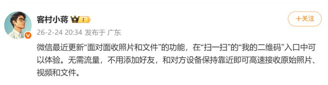 微信又有新功能上线!近日,微信员工“客村小蒋”发布微博称,微信最近更新了“面对面收照片和文件”的功能,在“扫一扫”的“我的二维码”入口中可以体验。无需流量,不用添加好友,和对方设备保持靠近即可高速接收原始照片、视频和文件。