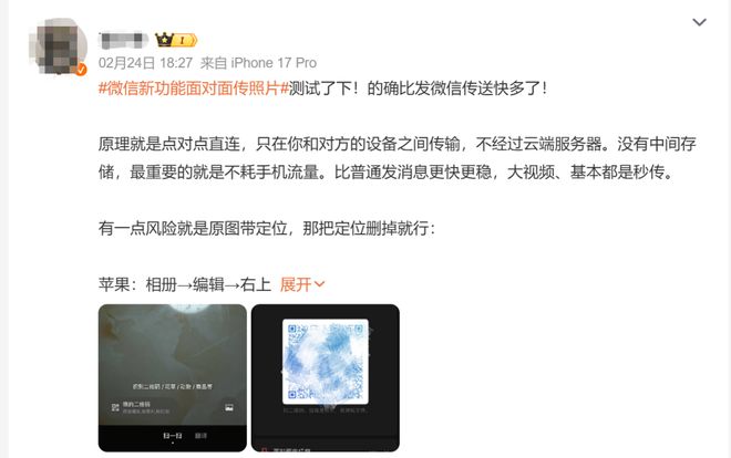 近期,多名博主分享对该功能的测试心得,均对传输速度表示肯定,认为适合面对面分享大文件。该功能解决了苹果端和Android端的视频传输需要,对自媒体运营、授课收集作业、摄影圈分享等场景非常友好。