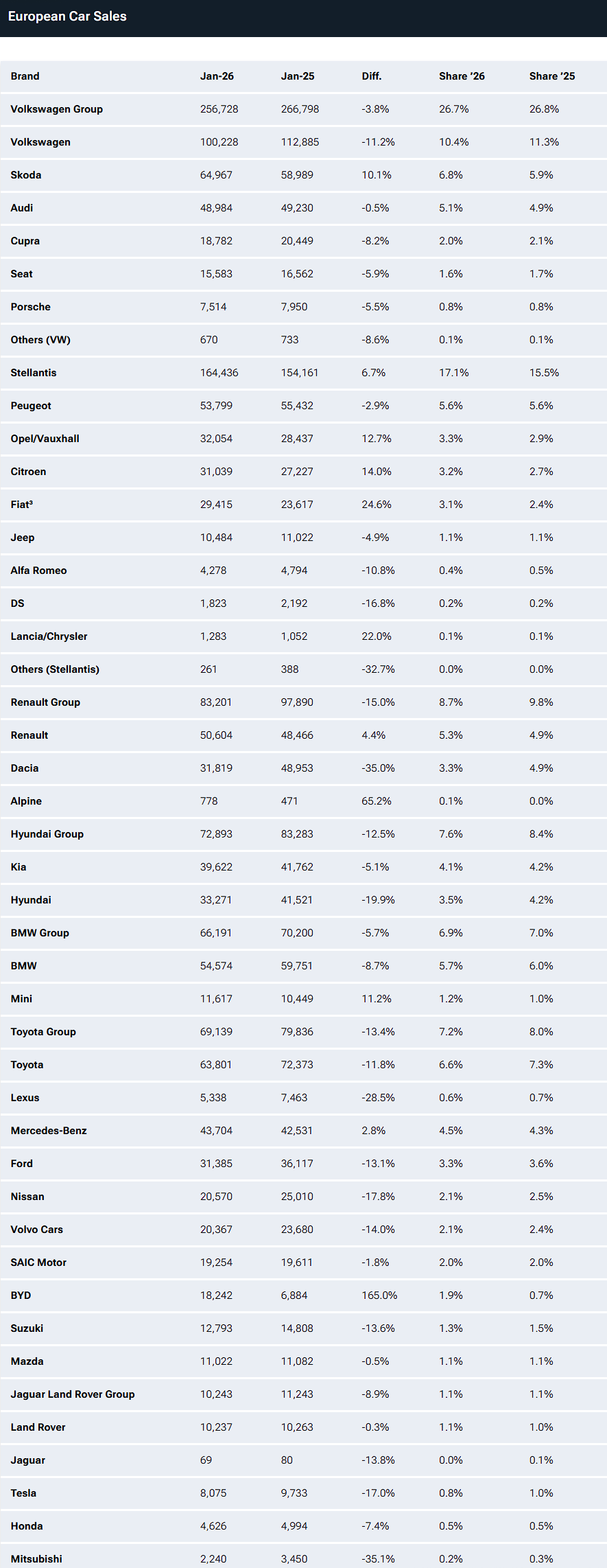 和比亚迪等中国车企相比,不少老牌欧洲车企同样在1月遭遇了和特斯拉类似的窘境: