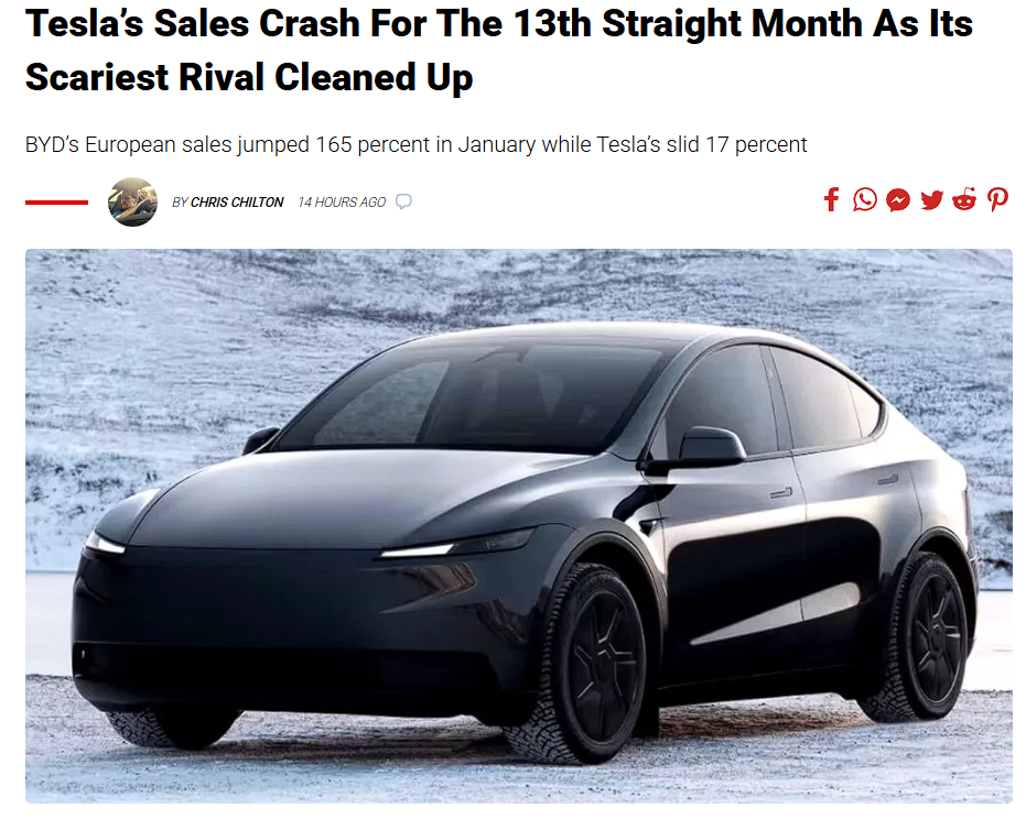 特斯拉1月在欧洲销量已不到比亚迪的一半